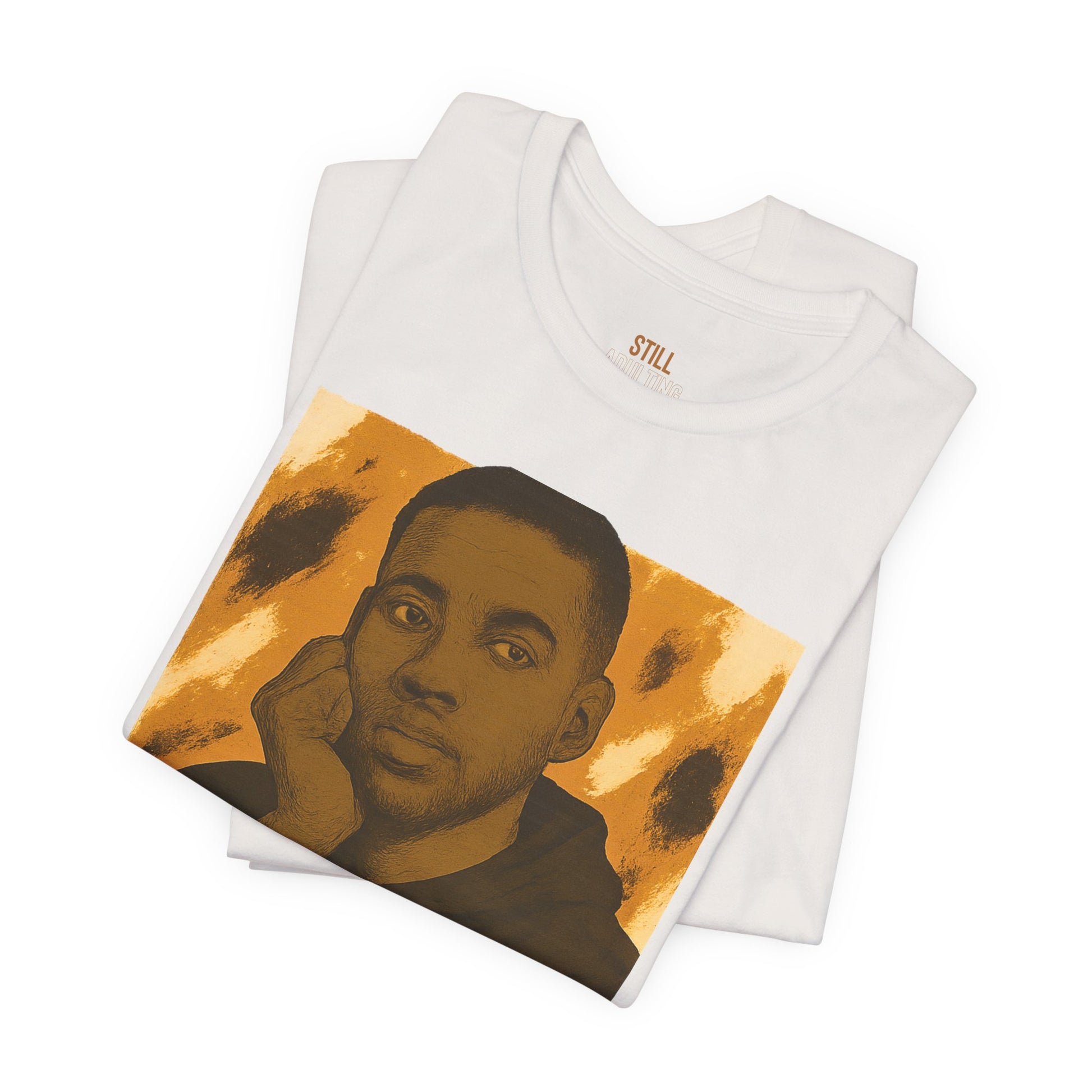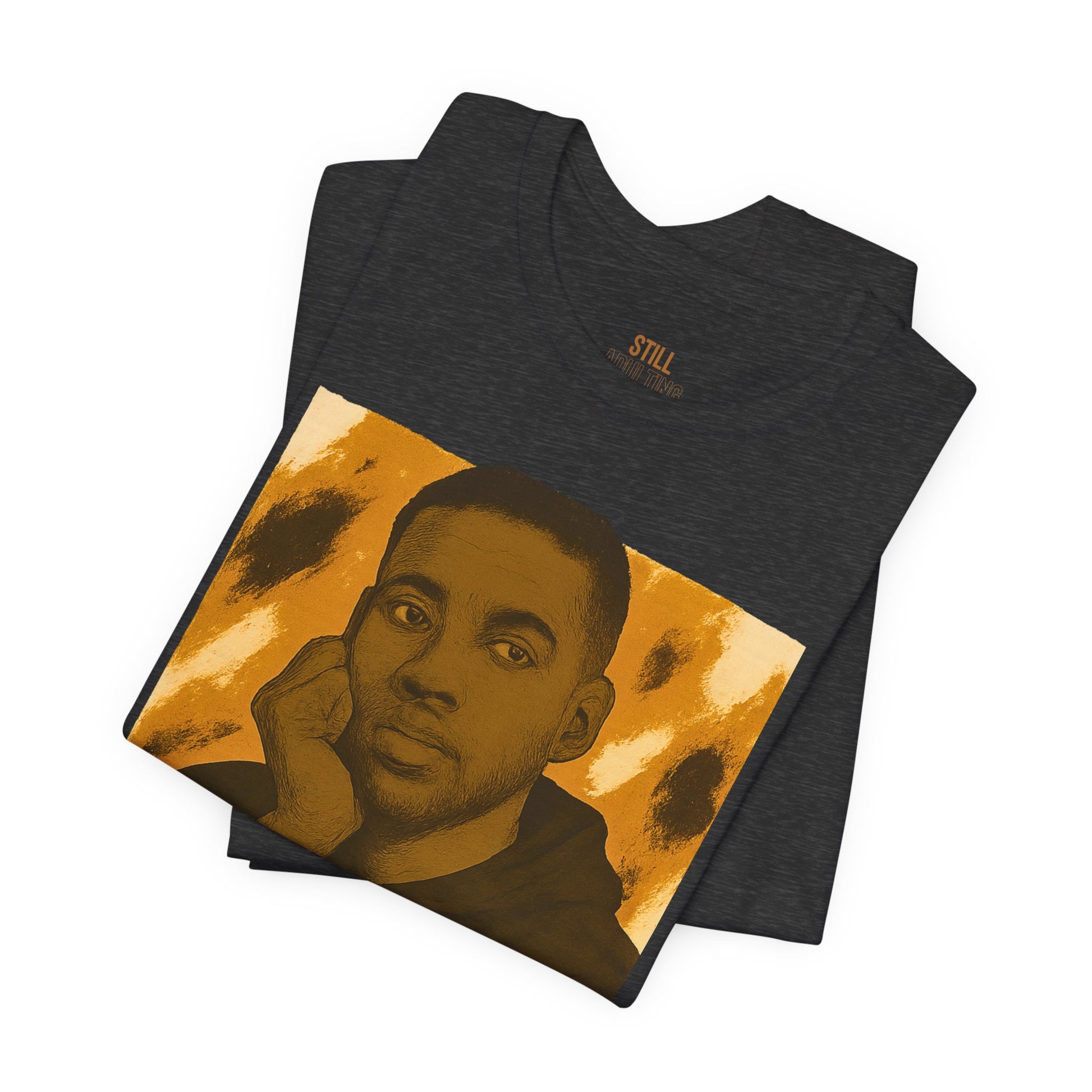 The front features a powerful illustration of a contemplative soul — a nod to those quiet moments of reflection we all know too well. Framed in bold, abstract tones inspired by our signature brand palette, this tee isn’t just fashion — it’s feeling seen.